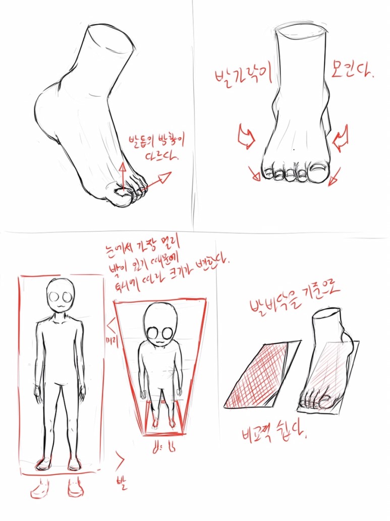 발의 형태와 관련된 내용 이어서 그리고 투시에 대한 유의사항에 대해 그렸습니다.