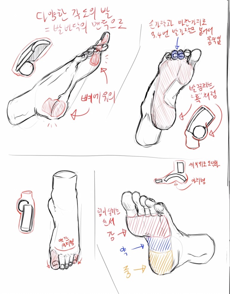발의 다양한 각도에 대해 그렸습니다. 발바닥을 기준으로 투시를 잡으니 수월하네요. 발등은 굽어진 판, 발꿈치를 혹처럼 생각하고 그리면 자연스럽게 그리기 좋습니다. 기본적인 골격은 손과 같다는 생각으로 그리면 좀 더 생동감있는 발을 그리기 좋을 것 같습니다.