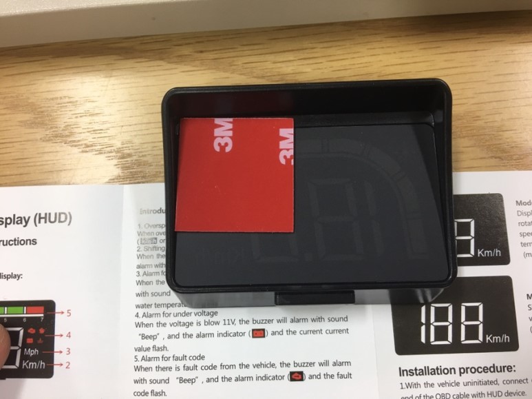 본체는 이렇게 생겼습니다. 양면테이프는 저것 안 쓰고, 새로 산 양면테이프를 저만큼 잘라서 새로 붙엿습니다. 눈부심 방지를 위해 가림막이 조금 올라온 부분이 몸쪽으로 오게 설치합니다. 운전석에서 기기를 보면 거꾸로 보게 설치합니다.