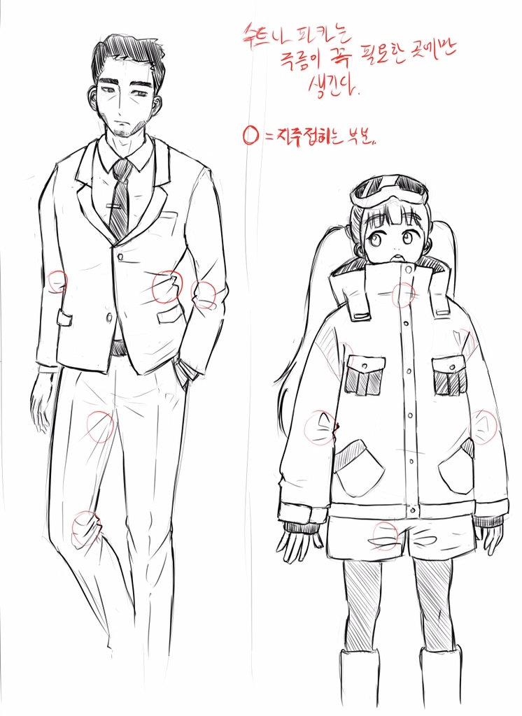 수트나 파카같이 재질에 강성이 있는 경우, 주름이 자주 생기는 부분에만 묘사를 해줍니다. 위 그림은 주름이 자주 생기는 부위만 표시한 그림입니다.