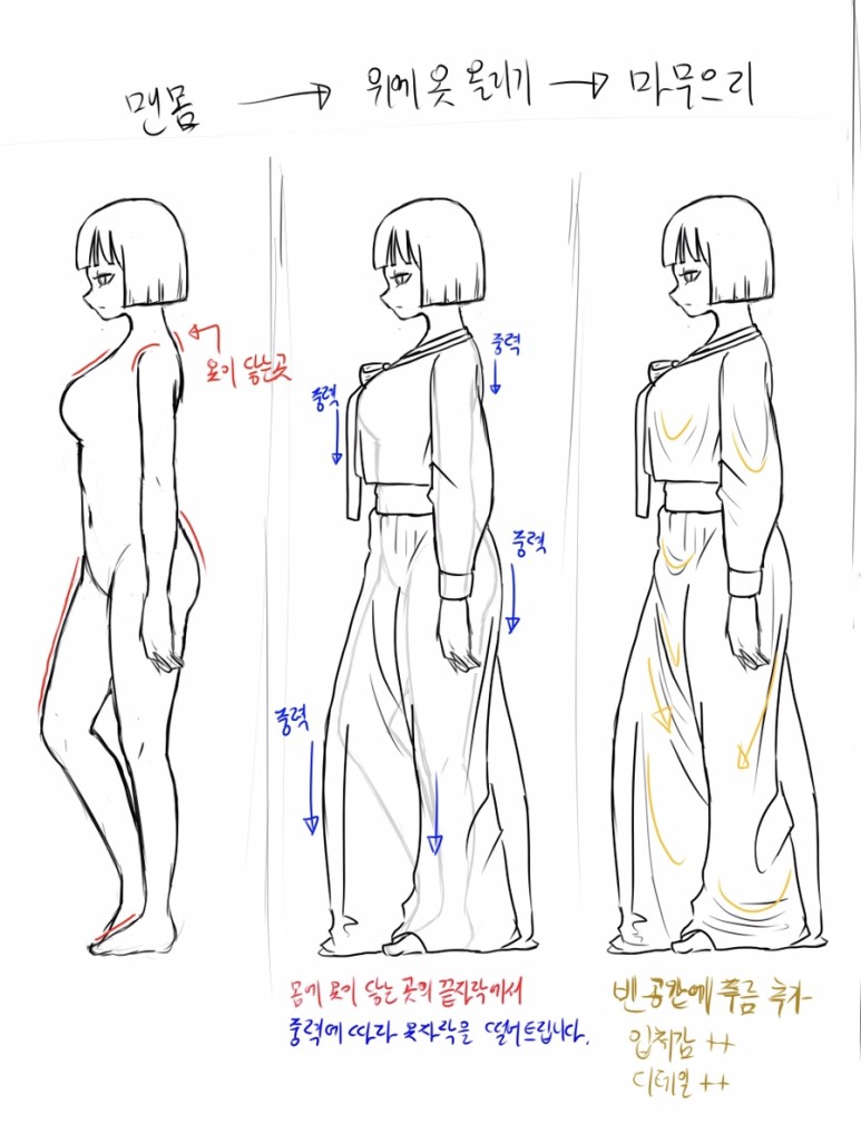 맨몸을 먼저 그립니다. 옷이 몸에 닿는 부위, 몸과 옷의 끝자락을 신경써서 옷의 형태를 잡아줍니