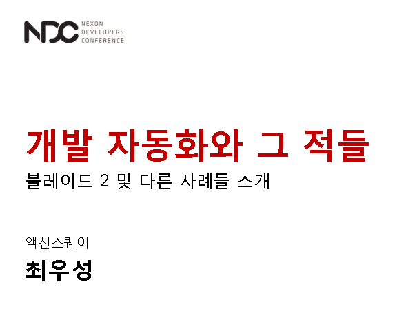 이 강연은 액션스퀘어의 최우성님이 수고해주셨습니다. "개발 자동화와 그 적들"이라는 제목으로, 얼핏 들으면 자칫 자동전투와 적들에 대한 이야기로 착각할 수도 있을 짤막한 제목이지만, 그 내용은 장기간의 경험들로 채워져 있었습니다.