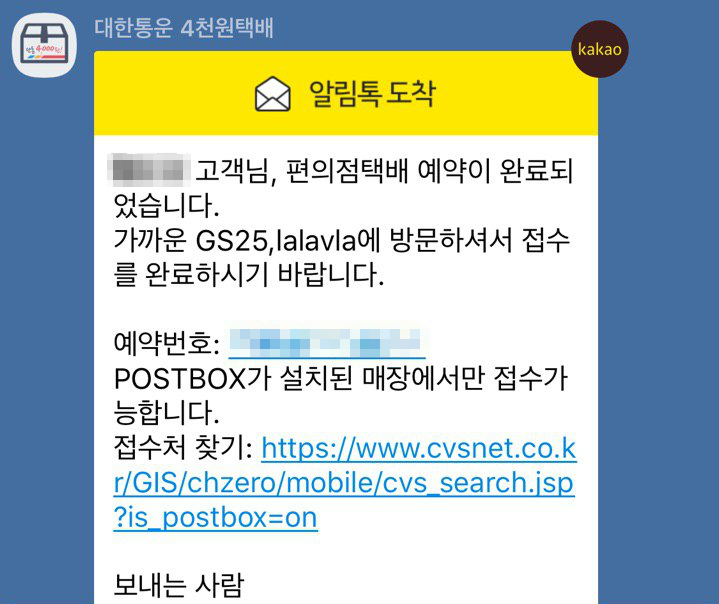 배송 정보를 입력하고 예약을 마치면, 카톡으로 예약정보 알림이 옵니다. 예약번호를 확인하고 스마트폰을 들고 편의점으로 갑니다. 다, postbox 기기가 설치돼있어서 택배 예약이 가능한 편의점이어야 합니다. 접수처는 위 링크나 카톡 링크로도 확인할 수 있습니다.