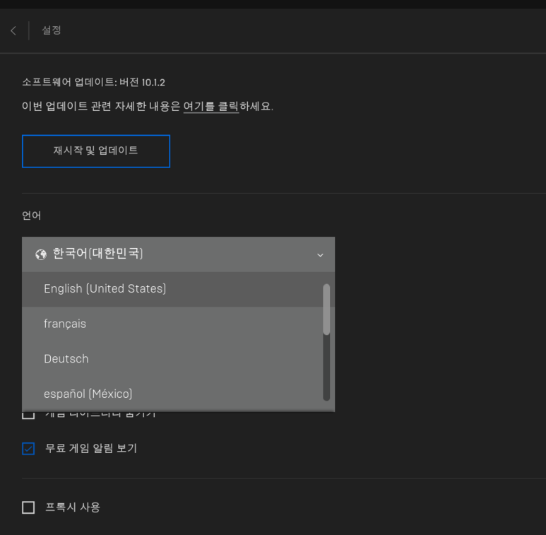 2. 언어 탭에서 "한국어"드랍다운 박스를 클릭하고 English 로 바꿔줍니다.