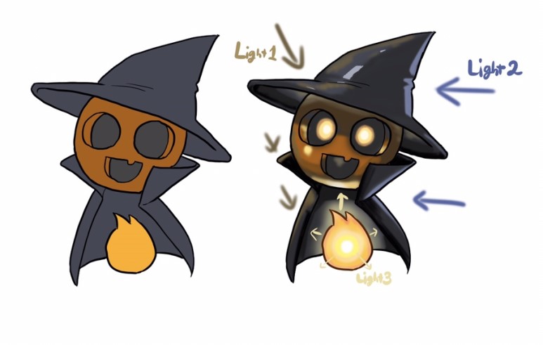 입체감을 확실히 살리고 싶다면 광원을 2개 이상 배치해서 컬러를 넣어주어, 어느곳이 밝아지고 영향을 받는지 묘사해 주면 좋습니다. 단일 광원으로는 입체감을 확실히 나타내기 어려운 편이라고 합니다.