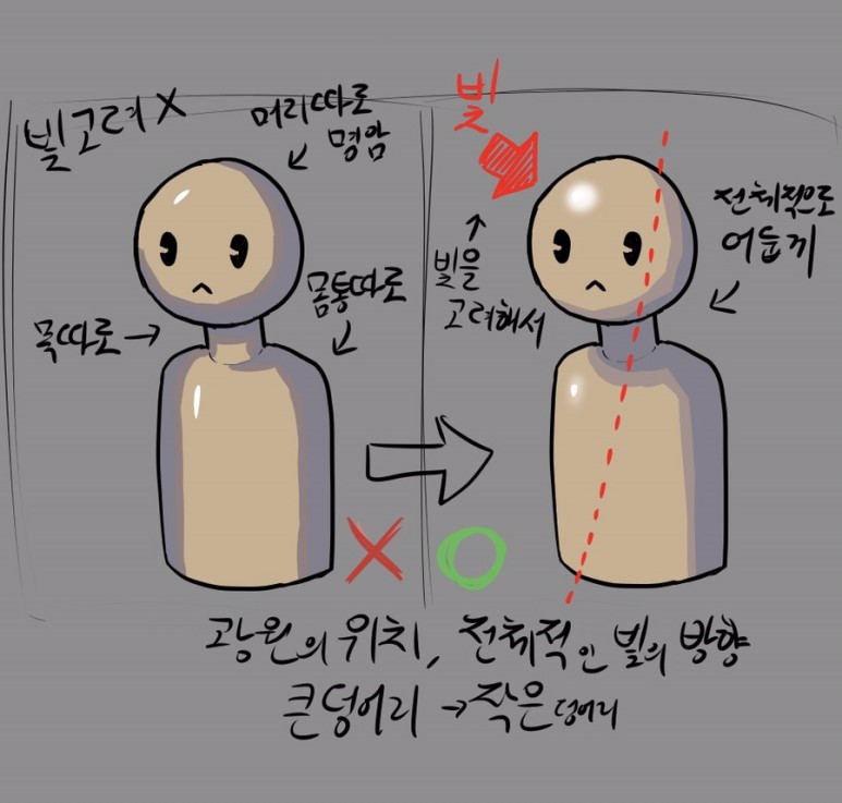 빛을 그릴 땐, 광원의 위치와 전체적인 빛의 방향을 고려해야 합니다.