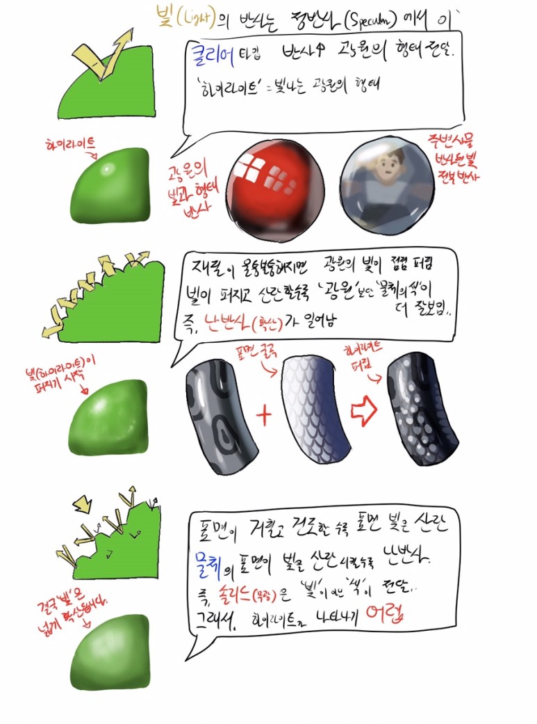 물체 표면의 재질에 따라 빛이 반사되는 형태에 대해 그렸습니다. 하이라이트는 광원의 형태와 세기를 반사하는 것. 난반사가 커질 수록 하이라이트는 맺히기 어려워집니다.