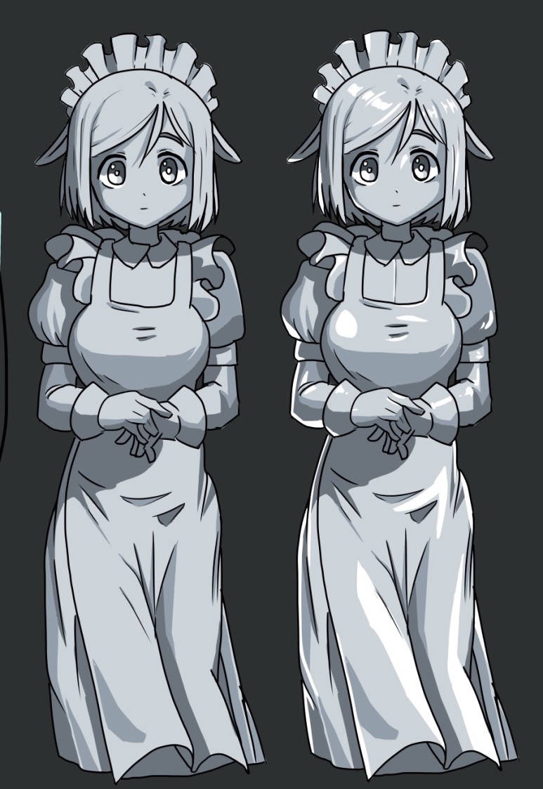 무채색으로 밝은 면과 어두운면을 칠하고(왼쪽) 하이라이트와 림라이트를 얹은 모습(오른쪽)