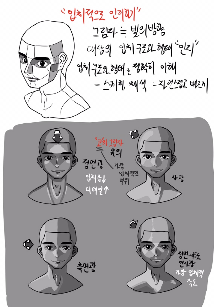 얼굴의 경우 입체적인 부위에 대한 이해를 바탕으로 그려줘야 함.