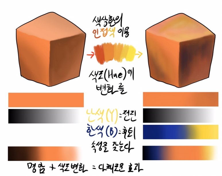 인접색을 활용해서 명암에 색조를 더해 다채롭게 그리고,