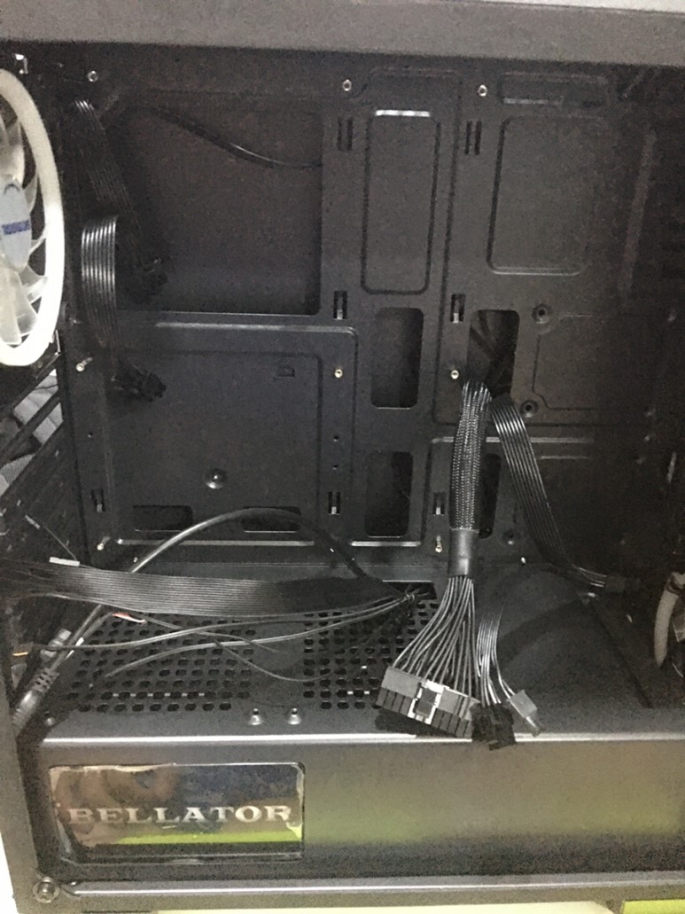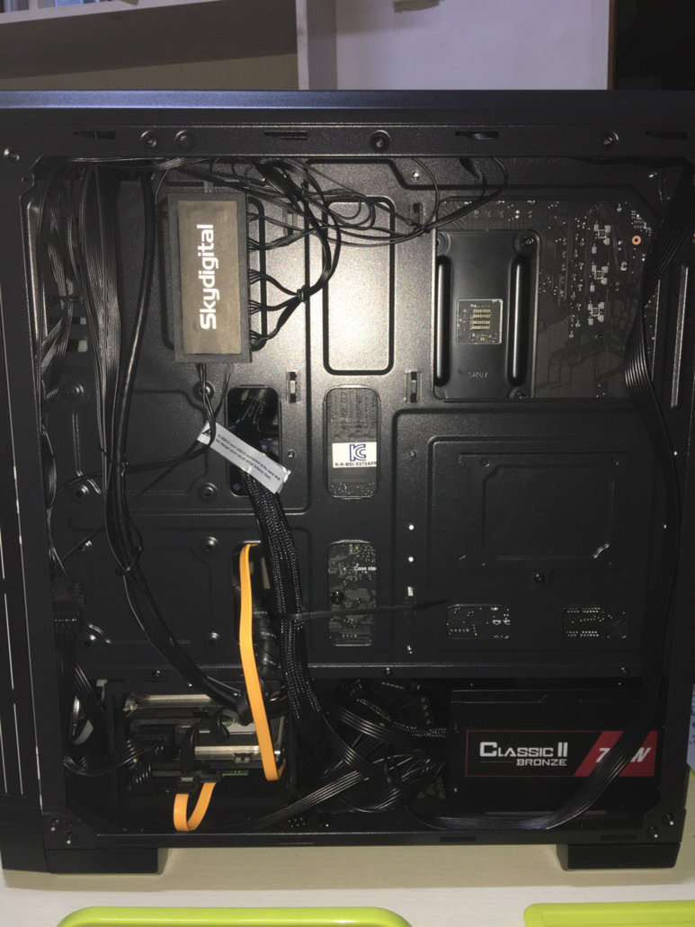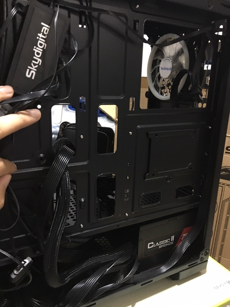 파워를 장착한 모습. CPU의 전원 공급선은 보드의 제일 위쪽에 위치하기 때문에, 본체 케이스의 뒤쪽 라인을 따라 위로 올려줬습니다. 메인보드 전원 공급 케이블과 그래픽카드 전원 공급용 PCI-E 파워는 중앙의 구멍을 통해 전원 선을 정리해서 넘겨줍니다.