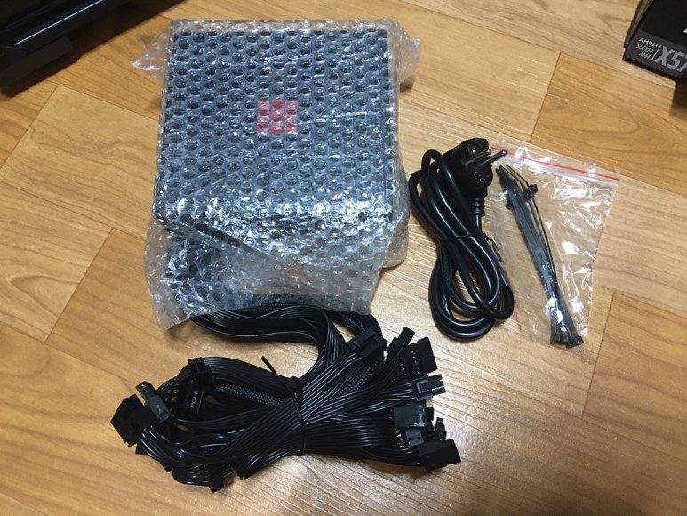 박스 내부는 이런 구성. 파워와 전원 공급선들, 본체의 파워 케이블, 케이블 타이가 들어있습니다. 선 정리를 위해 케이블 타이는 소중.