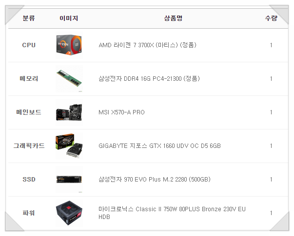 그래서 똑같이 CPU는 Ryzen 7 3700X 에 그래픽카드는 1660, RAM 16G 스펙의 동급 조립 PC 를 다나와 샵에서 판매하는 금액과 비교해보니, 제가 대략 20만원 정도는 저렴하게 맞춘 것 같습니다.