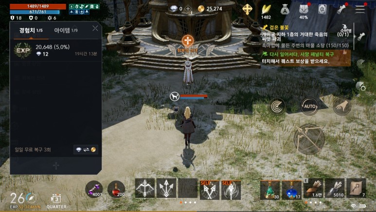 리니지 시리즈의 특징(?)이라고 해야할지... 사망 패널티가 좀 쎕니다. 경험치도 잃고 장비를 잃기도 합니다. 대신, 신녀님께 조공(...)을 바치면 복구를 해주는 식입니다.