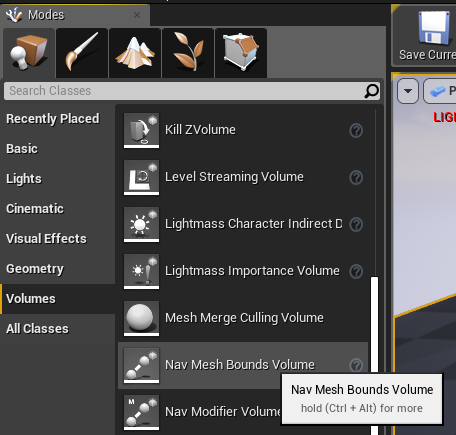 Modes 패널에서 Nav Mesh Bounds Volume 을 생성.