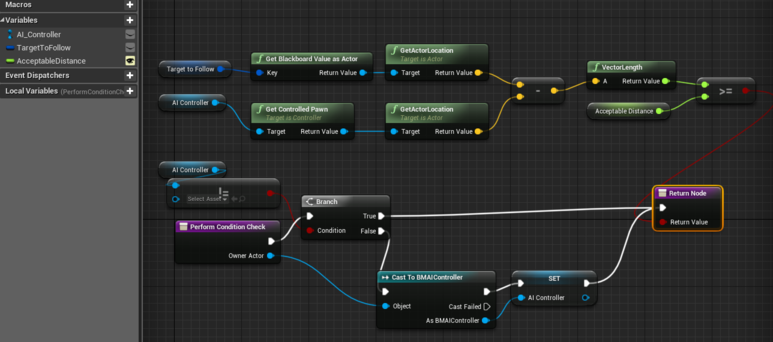 이번에도 블루프린트로 로직을 작성한다. Perform Condition Check 함수를 오버라이드 해서 시작. 반환 타입을 가지는 함수로 boolean 타입을 반환해야 함. TargetToFollow 블랙코드 키의 액터가 특정 범위 내에 있는지 체크하는 로직을 작성한다.