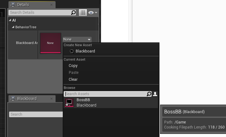 Behavior Tree 편집기. 우측 패널의 상단이 Details창, 하단이 Blackboard 창.