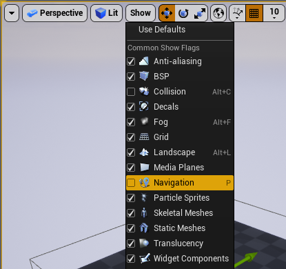 P 단축키로 뷰포트에서 NavMesh 를 볼 수 있음.