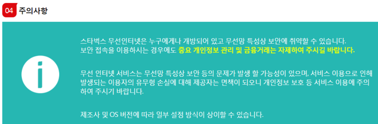 하지만, 통신 내용이 보안처리 되지 않은 연결입니다. 그렇기 때문에 스타벅스에서도 보안되지 않은 연결 상에서 개인정보가 필요한 작업은 가급적 이용하지 말라고 안내합니다.