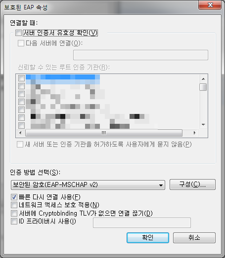 6. 아래 그림과 같이, "서버 인증서 유효성 확인"을 해제하고