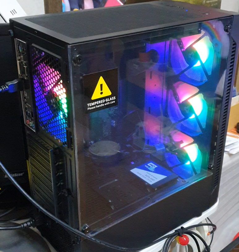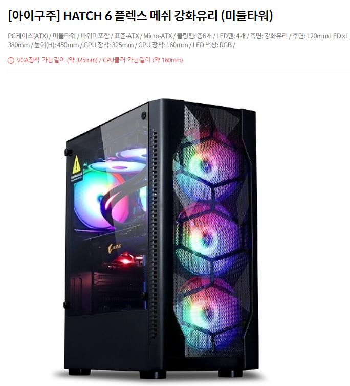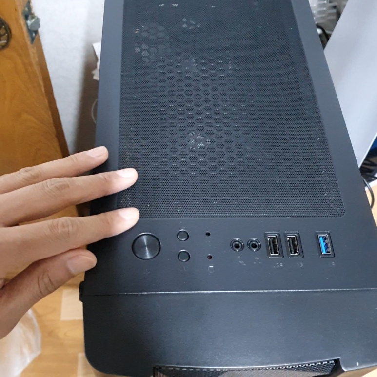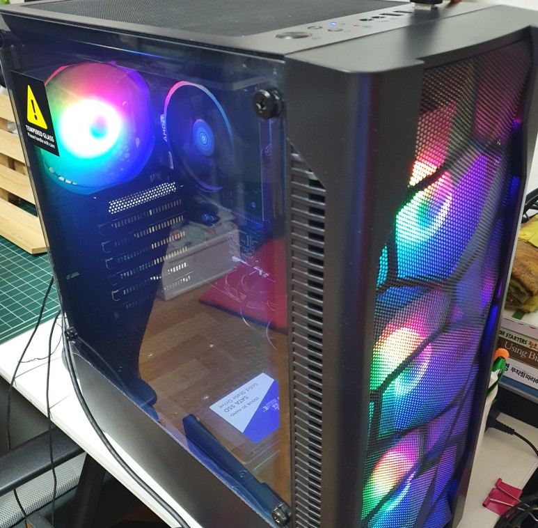 케이스는 통기성이 좋은 전면 매쉬 재질인 것으로 골랐습니다. 이 모델은 쿨링팬이 총 6개나 달려있어 발열은 확실하게 잡을 수 있는 녀석입니다. CPU가 내장 그래픽이라 왠지 발열이 있을 것 같아 케이스는 좀 더 신경써서 골랐습니다. 팬 6개가 한꺼버에 돌아가도 소음은 작은 편입니다.
