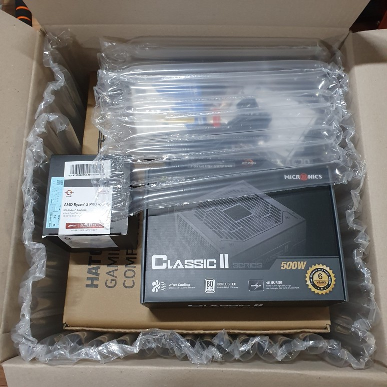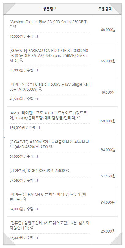 저렴한 가격대를 위해, 요즘 한창 가격이 올라있는 그래픽카드는 과감하게 빼버리고, 내장 그래픽 유닛이 탑재된 CPU로 선택했습니다. AMD3 프로 4350G. 이 조립 구성에서 가장 비싼 부품이네요.