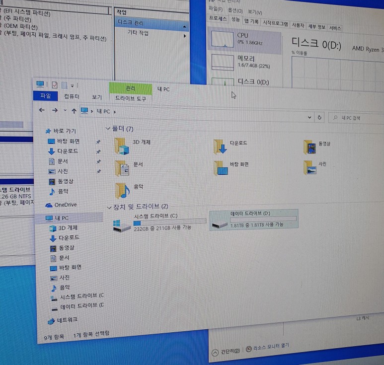 드라이브 설정도 마쳤습니다. C: 는 250G SSD로 시스템 드라이브로 설정하고, D 드라이브는 2TB 데이터 드라이브로 설정.