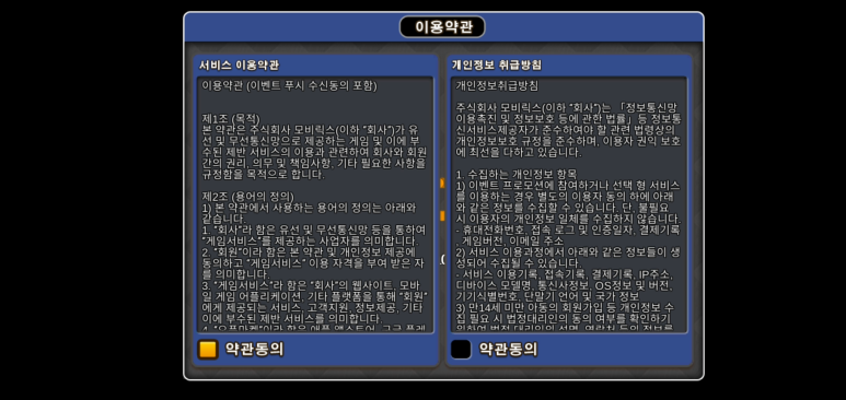 처음 게임 설치 시 법적으로 동의가 필요한 절차 진행 해주고, 바로 타이틀 화면으로.