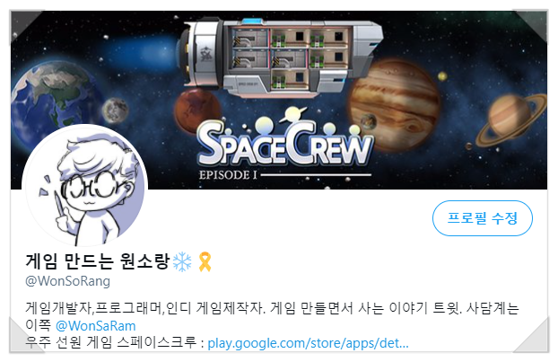 저의 SNS 프로필입니다. 게임의 콘텐츠가 얼마나 독립적이냐는 온전히 게이머의 판단이라고 생각해서, 저는 회사원임과 동시에 여가시간에 게임을 제작하는 "인디 게임개발자"라고 소개합니다.