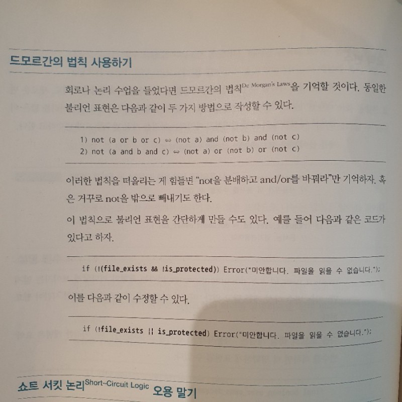 특히 흐름제어 내용은 제가 좋아하는 내용들이 많았습니다.조건문을 깔끔하고 쉽게 사용하는 방법. goto 문을 왜 지양해야 하는지? 드모르간의 법칙, 쇼트 서킷 논리 오용 등.