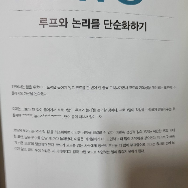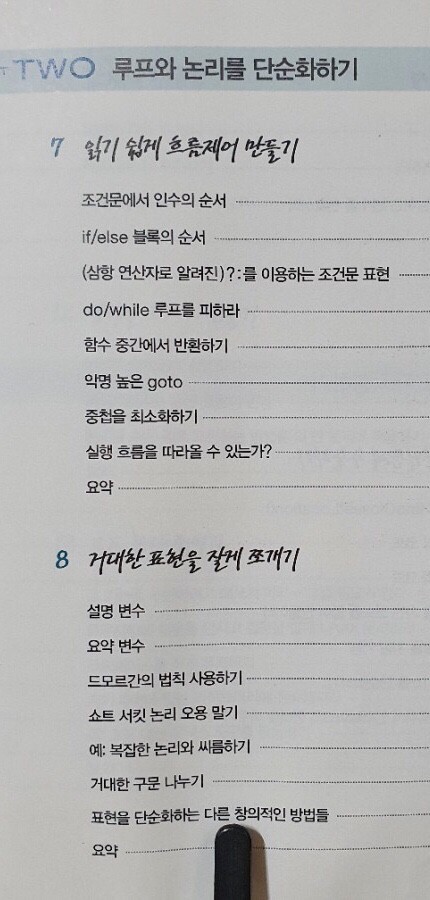 나쁜 코드의 예를 분석하고, 그러한 코드가 왜 나쁜지, 그리고 어떻게 개선할 수 있을지 연구한 결과가 바로 이 책이라고 합니다. 이름짓기와 주석, 포맷팅, 논리, 루프 제어, 복잡성 관리, 코드 블록 정리 등등. 결과적으론 재밌고 유익하게 읽었습니다.
