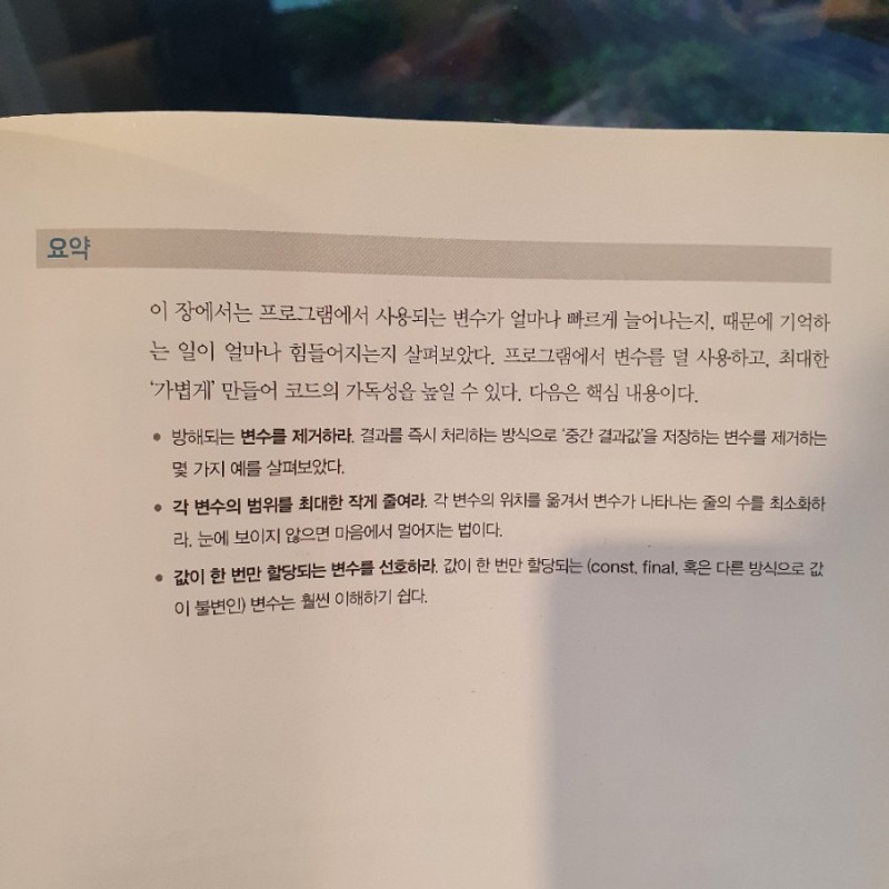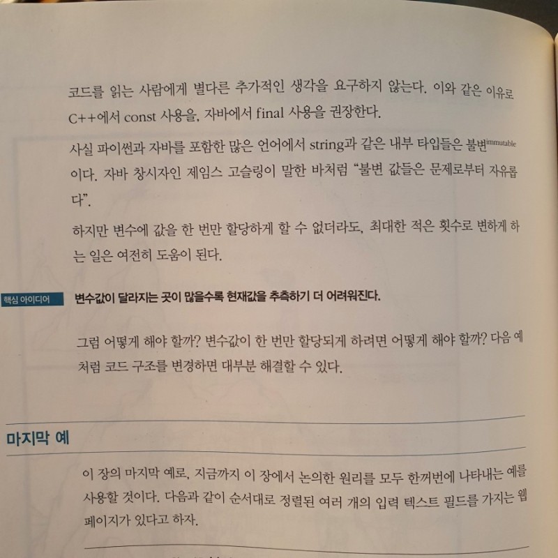 변수의 값은 최대한 적은 횟수로 변하게 해야한다는 조언. 변수의 변경은 곧 프로그램 상태의 변화이기 때문에 상태를 변경하는 곳, 코드는 한 개가 제일 좋고, 그게 어렵다면 가능한 줄여야 합니다.