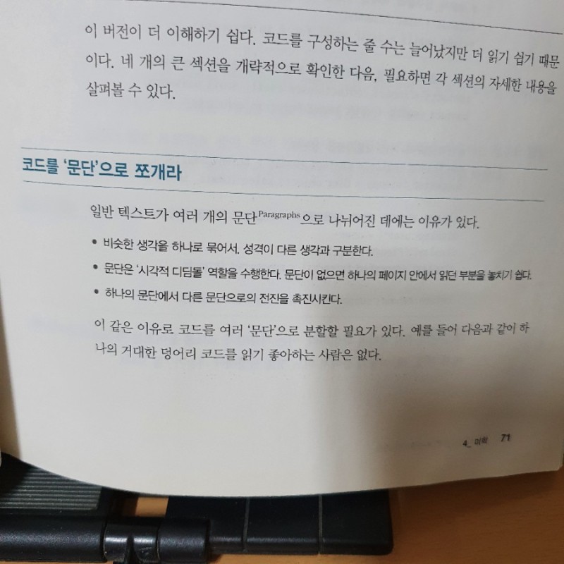 코드를 문단으로 나누어 정리한 예시. 이렇듯 프로그래밍 “언어”를 좀 더 고품질로 작성하는 방법에 대해 다루는 책입니다.