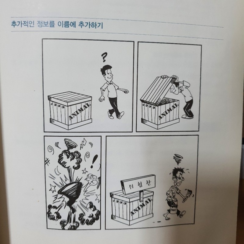 이름을 잘 지어야 하는 이유에 대한 4컷 만화.