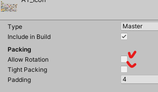 위 이미지와 같이 Allow Rotation, Tight Packing 둘 다 꺼주면 Atlas 묶기 효율은 조금 떨어질 수 있지만, 다른 사이드 이펙트나 자잘한 문제는 해결할 수 있습니다.