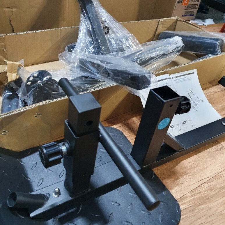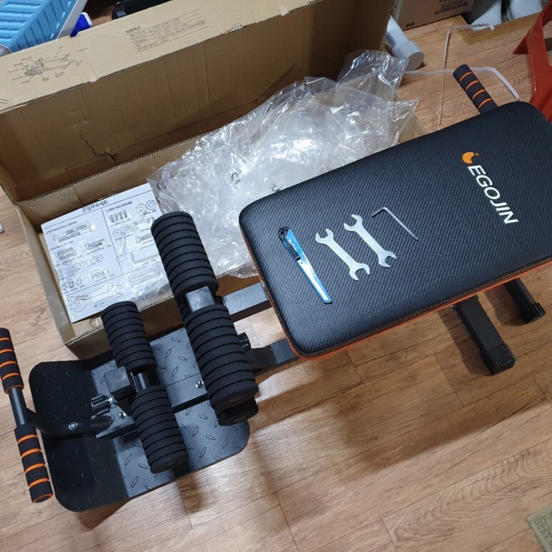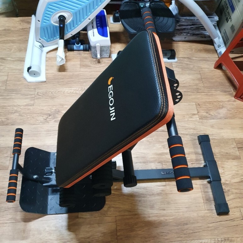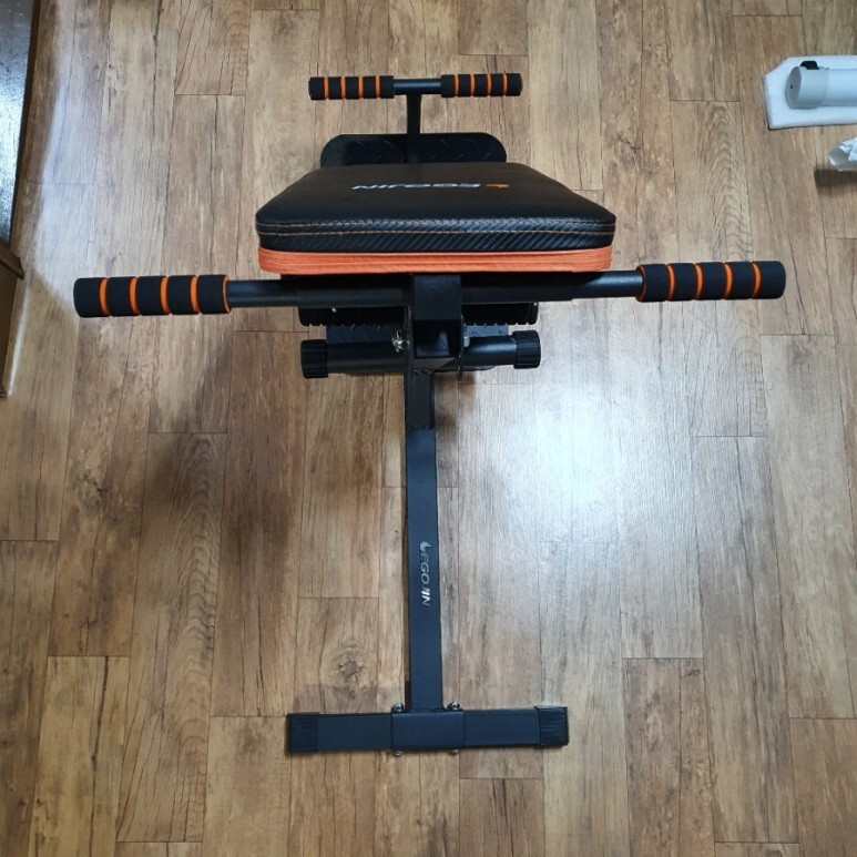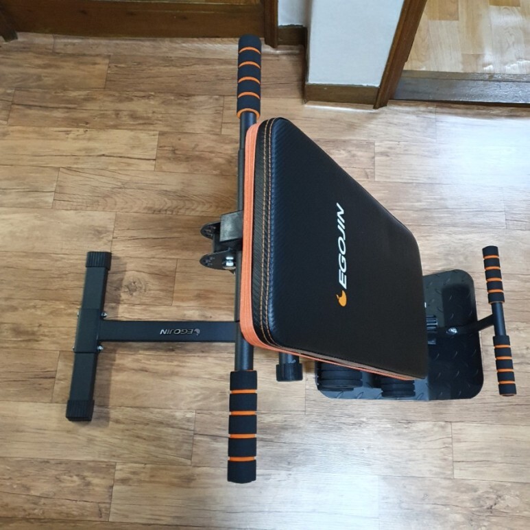 조립 끝. 벤치 형태로 조립이 끝난 모습입니다. 윗몸일으키기(싯업)을 기본으로 할 수 있는 모습. 벤치 형태로 할 수 있는 다양한 운동도 소화할 수 있습니다.