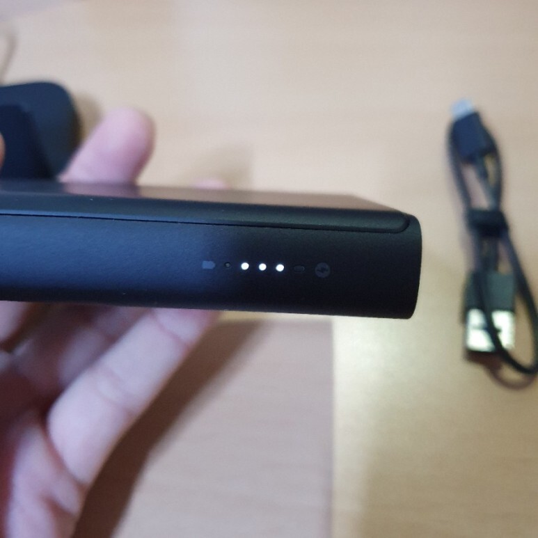 충전량은 옆면에 LED 램프로 확인할 수 있습니다. 10000 mAh 이면 핸드폰 완충 2번도 가능한 용량이라 넉넉하지요. 두 개 기기를 동시 충전해도 둘 다 완충시키고도 남을 용량입니다.
