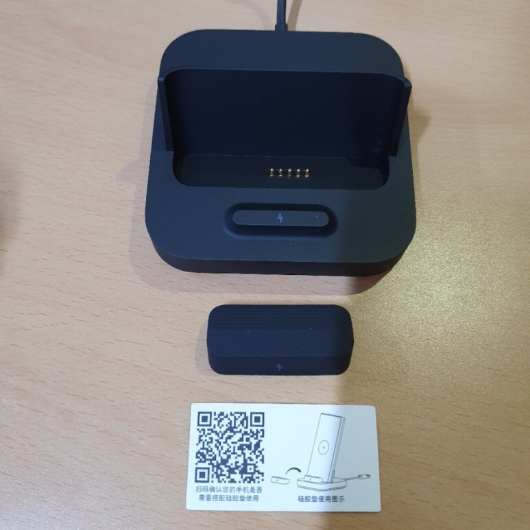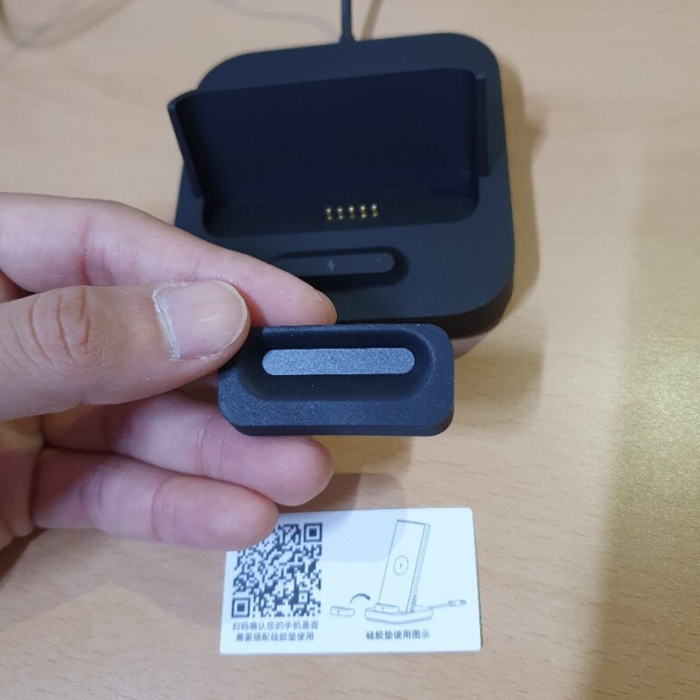 도크는 이렇게 생겼습니다. 나름 견고하고 고급진 느낌의 재질. 아래 작은 부품은 핸드폰 크기가 작은 모델을 위해 충전 위치를 조정할 때 사용하는 받침대입니다.