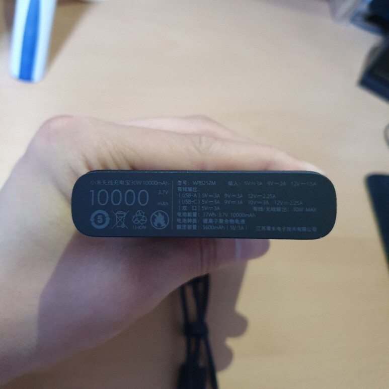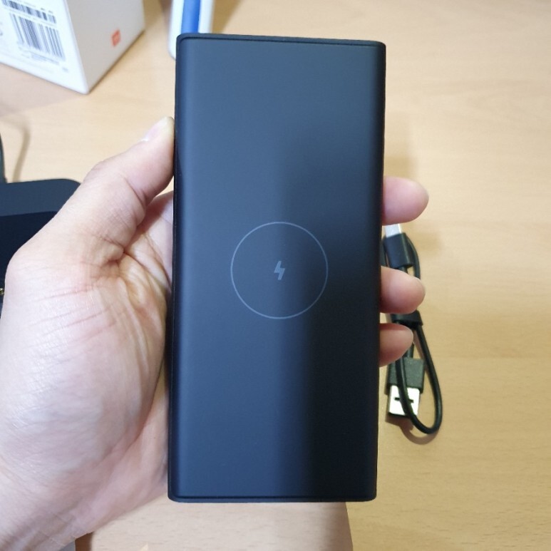보조배터리 전면부. 중앙에 충전 코일이 들어있을 것으로 예상됩니다. 사실 무선 충전 자체는 지난번 리뷰했던 5000원짜리 다이소 무선충전기와 동일할 거에요.