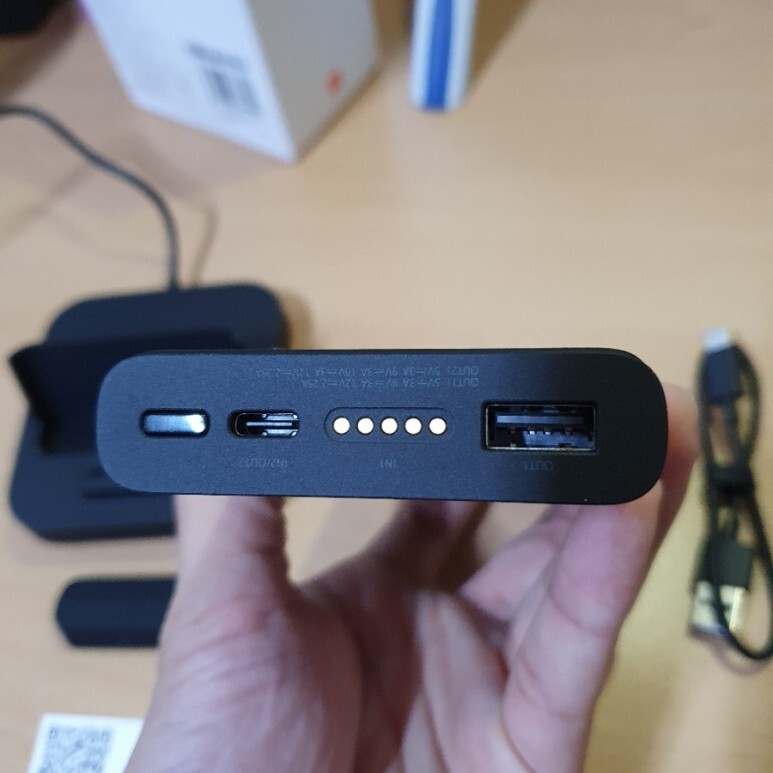 5핀은 도크에 올려서 보조배터리를 충전할 때 사용하는 입력 전용. 마지막 오른쪽은 USB-A 타입 출력 포트로 다양한 기기를 충전할 수 있지요.