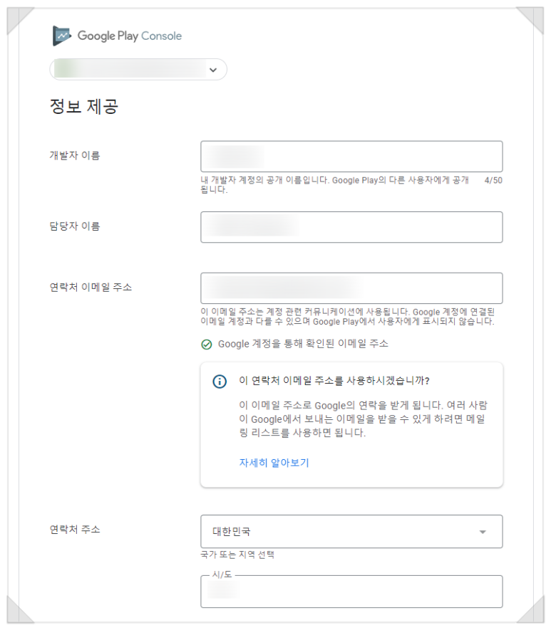 정보 제공 페이지에서 요구하는 모든 정보를 입력합니다. 이메일 주소는 꼭 인증 절차를 거쳐야 하고, 주소는 상세주소1 까지 입력을 해주셔야 합니다. 유의해야 할 점은 개발자 이름이 구글플레이에 노출되는 이름이기 때문에, 브랜딩을 고려하고 있다면 브랜드 이름으로 입력하셔야 합니다.