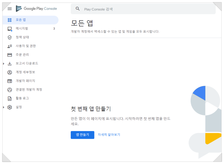 구글 콘솔 첫 화면에 진입한 모습입니다. 이제 새로 개발한 앱을 올려서 배포할 수 있습니다.