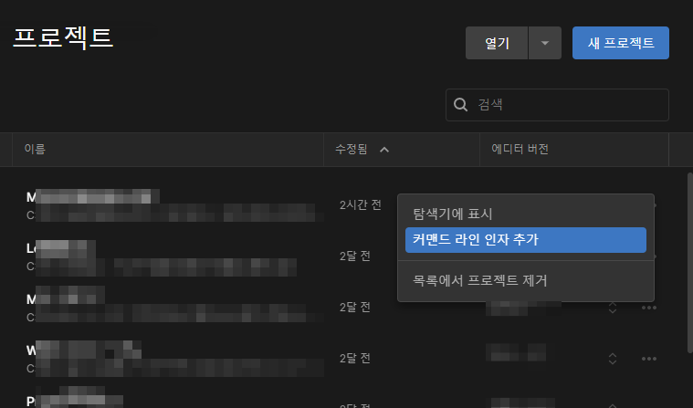 허브의 가장 기본이자 핵심은 유니티 에디터 버전과 프로젝트 관리이니 자잘한 내용들은 크게 신경쓰지 않아도 될 것 같습니다. 가장 기본적인 프로젝트 뷰. 다크모드라 그런지 새로운 느낌이긴 한데, 허브 2.0 과 거의 동일합니다. 허브 2.0 에도 있었는지는 잘 기억이 안 나는데, 커맨드 라인 인자 추가 메뉴가 눈에 띄었습니다.