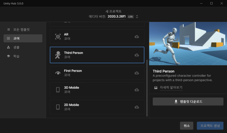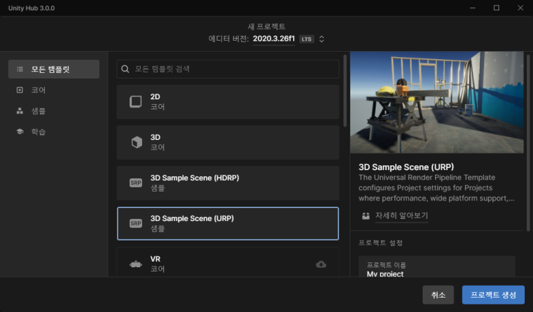 일반적으로 새로운 프로그램을 개살할 땐 "코어"에서 선택해서 시작하면 되고, 샘플과 학습 프로젝트도 적절히 생성해서 진행할 수 있도록 잘 정리되어있습니다. 상단에 어던 에디터 버전으로 생성할지도 눈에 띄게 구분을 해두었습니다.