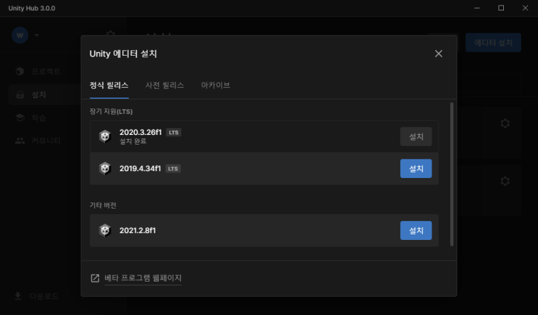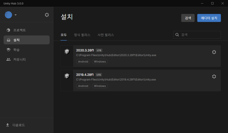 엔진 설치 관리 탭도 이렇게 변경되었습니다. "에디터 설치" 를 클릭하면, 이렇게 좀 더 알아보기 쉽게 정리된 모습입니다. 보통은 LTS(장기 지원) 버전을 설치하기 때문에 위에 따로 구분을 해둔 모습.