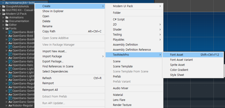 위에서 언급한 Noto Sans Korean 폰트를 유니티 프로젝트 하위 폴더로 이동시킨 후, 아래 그림처럼 폰트를 우클릭해서 폰트 에셋을 만들어줍니다. 폰트 파일을 우클릭하고, Create > TextMeshPro > FontAsset 클릭.