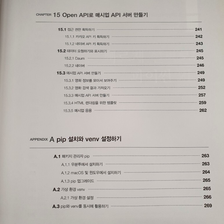 마지막 부록은 패키지 관리자 pip 설치와 가상환경인 venv 설치하는 방법을 다룹니다. 저도 리눅스 환경이 아직 익숙치 않아서 이런 정보들은 매번 검색해서 활용하고 있는데, 기본적인 내용들이라 책에서 다뤄주는 친절함도 옅보입니다.