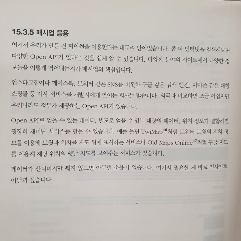 마지막으로, 매시업 응용 방향성까지 제시하면서 책 본문을 마무리 합니다. 여러 Open API 를 활용해서 파이썬으로 빠르게 실용적인 다양한 애플리케이션을 만들면 도움도 되고 재밌을 것 같습니다. 이 책이 나온 이후로 몇년이 흘렀는데, 그동안 Open API 를 활용해 새로 만들어진 서비스도 아주 많을 것 같습니다. 파이썬으로 만들어지지 않았더라고 그 활용 방향은 동일하기 때문에 이 책과 파이썬으로 찍먹 해보기 좋을 것 같습니다.