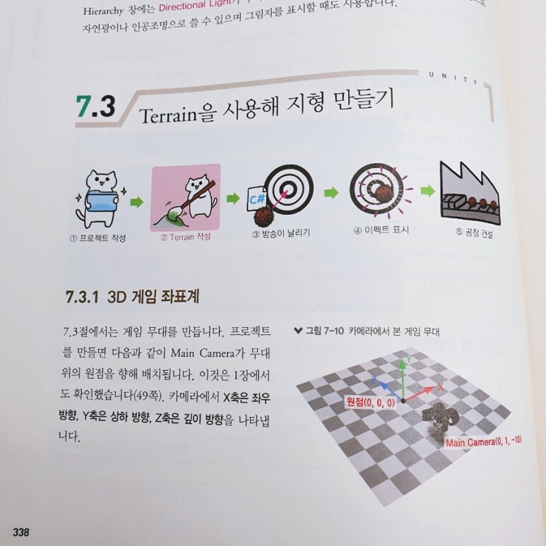 간단한 2D 게임은 물론, 3D 게임 제작도 다루기 때문에 애니메이션과 3D 환경, 터레인(지형) 제작까지 다루고 있습니다. 입문서적이라고 해서 쉽고 간단한 것만 따라하게 가이드 하기보다는 게임 제작이라는 방향에 포커스를 맞춰 넓은 내용을 다루고 있습니다.