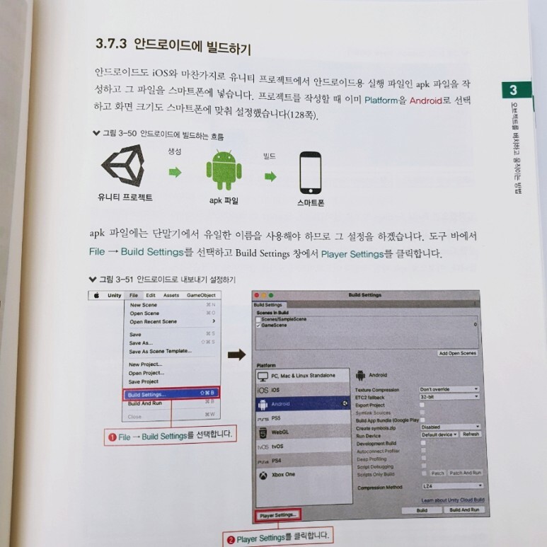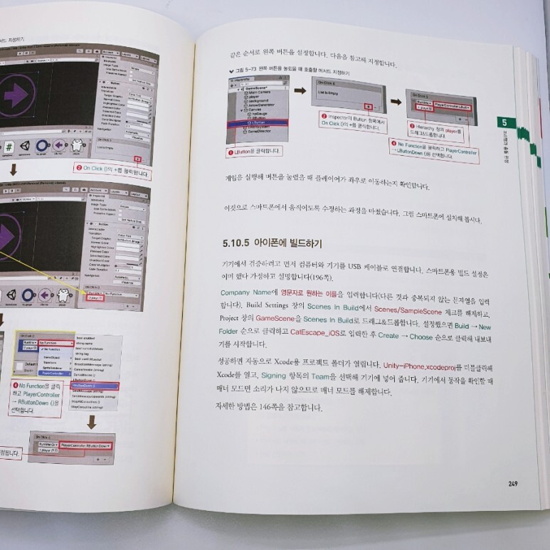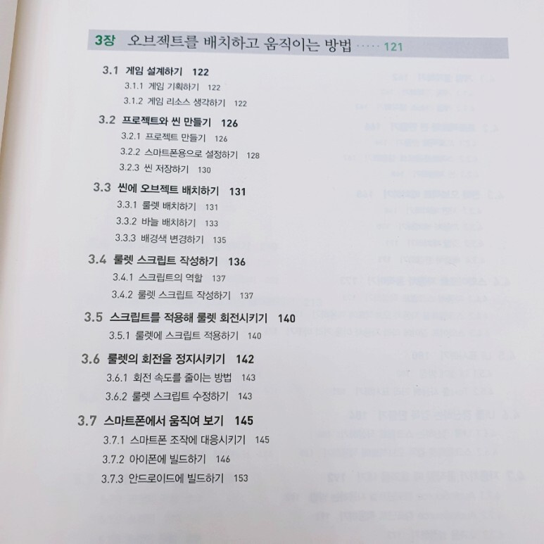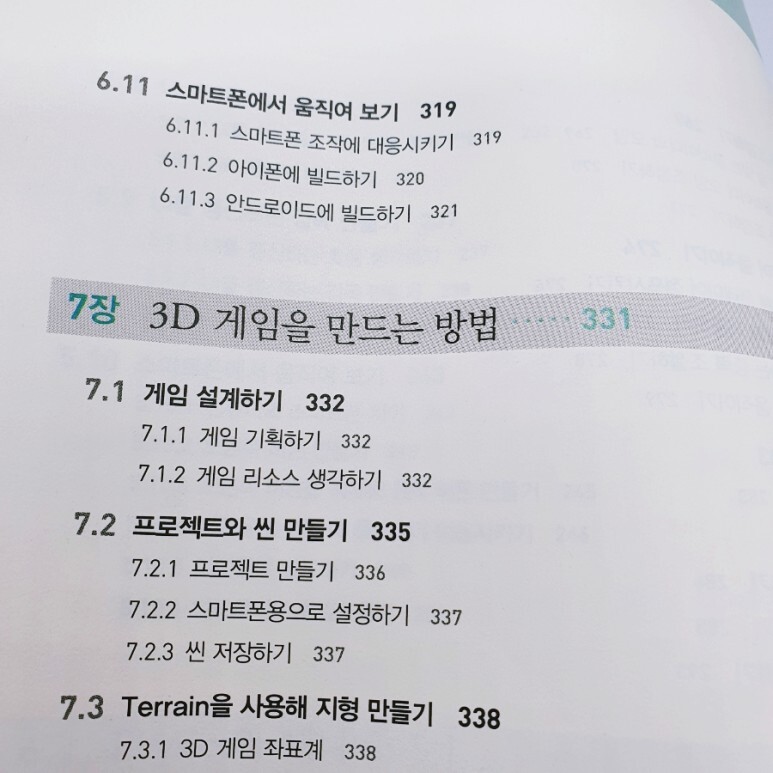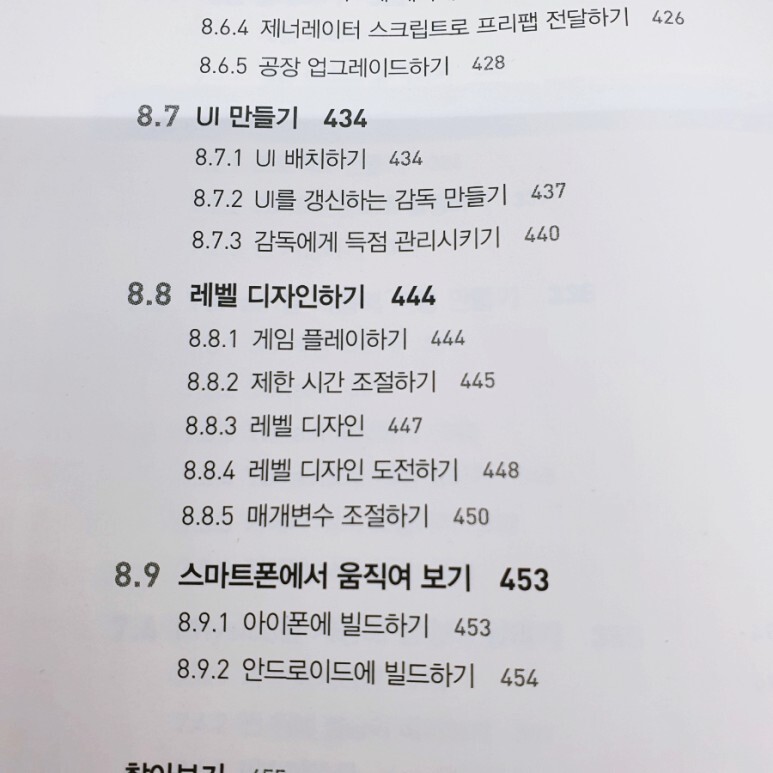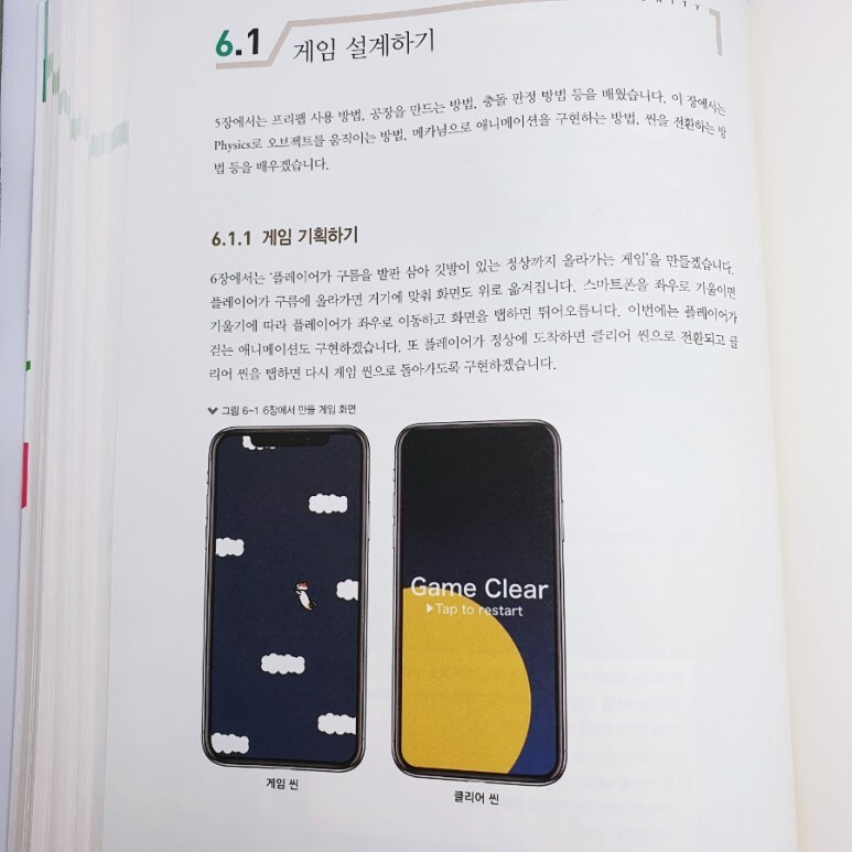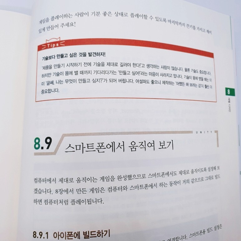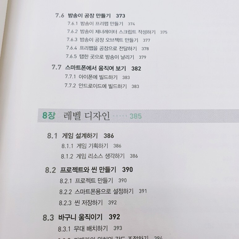 모든 챕터의 시작은 게임을 설계하고, 그 챕터의 마지막은 스마트폰에 빌드해서 실제 구동시켜 보는 것으로 끝납니다. 이 목차만 봐도 이 책이 실제 게임을 만들어 테스트 하는 것에 그치지 않고, 스마트폰으로 배포해서 플레이 시켜줄 수 있게 해주려 한다는 걸 알 수 있습니다.